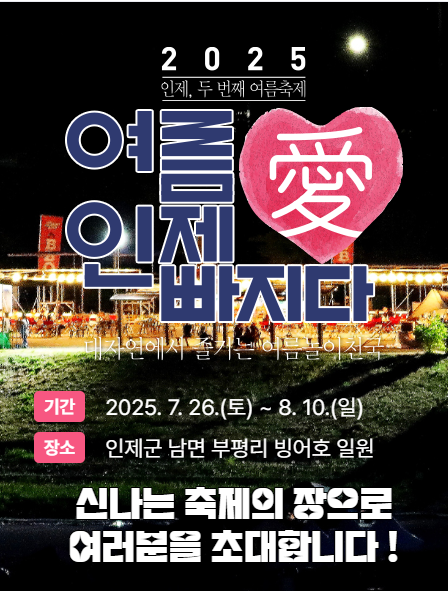 인제 여름축제는 7월 26일(토)부터 8월 10일(일)까지 열려요.