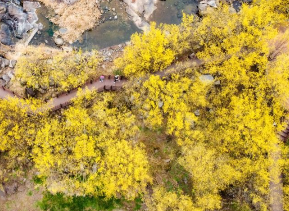 매년 3월이 되면 이 나무들이 한꺼번에 노란 꽃을 피워 마을 전체가 황금빛으로 물듭니다.