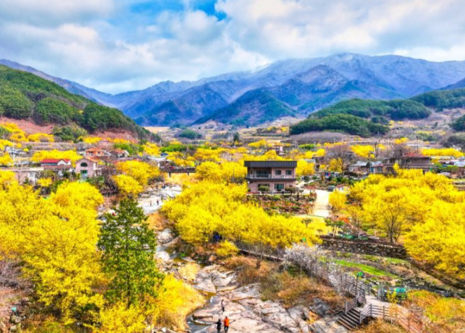 매년 3월이 되면 이 나무들이 한꺼번에 노란 꽃을 피워 마을 전체가 황금빛으로 물듭니다.