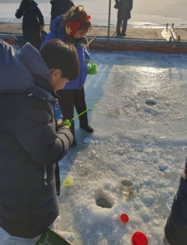 ㅁ얼음 위 구멍을 뚫고 낚싯대를 드리워 빙어를 낚는 기본 체험