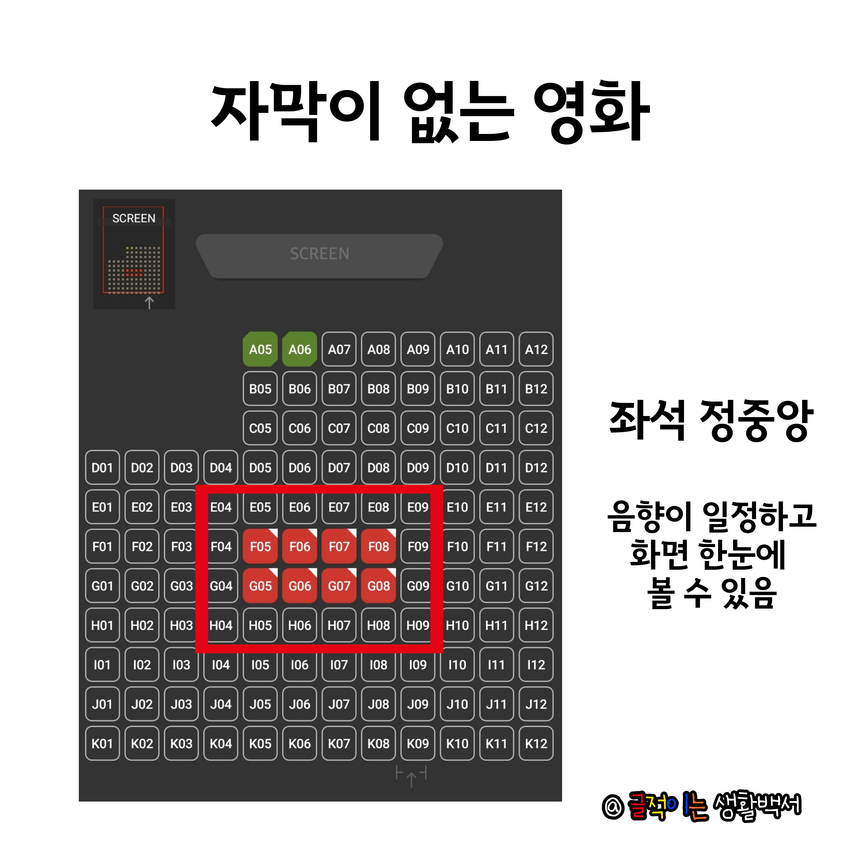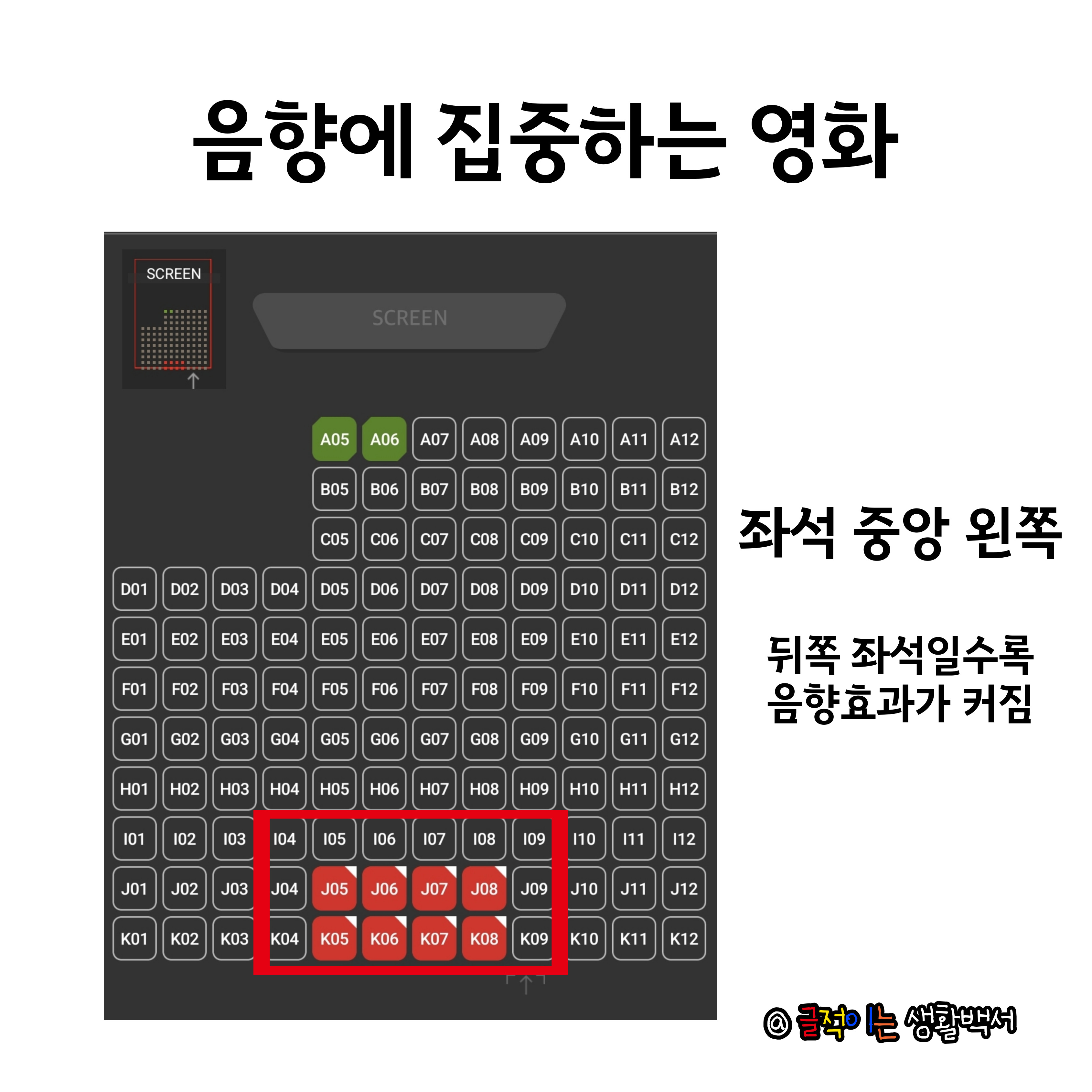 이렇게 자막이 있는 영화, 자막이 없는 영화, 음향에 집중해야 하는 영화, 화면에 집중해야 하는 영화를 볼 때 좋은 자리를 알아봤습니다. 영화관 중앙 좌석을 기준으로 화면에 좀 더 집중해야 할 때는 앞쪽, 음향에 집중해야 할 때는 뒤쪽 그리고 자막을 읽어야 할 때는 왼쪽으로 정리할 수 있을 것 같습니다.