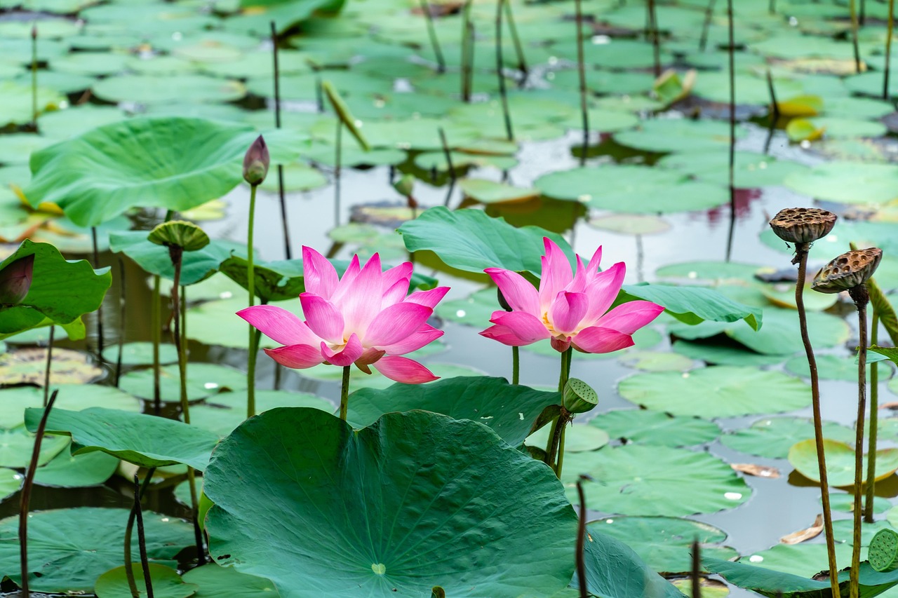 연꽃이 만개하는 7월에는 장관을 이뤄 다양한 색상의 연꽃과 수련이 어우러져 환상적인 풍경을 선사합니다.